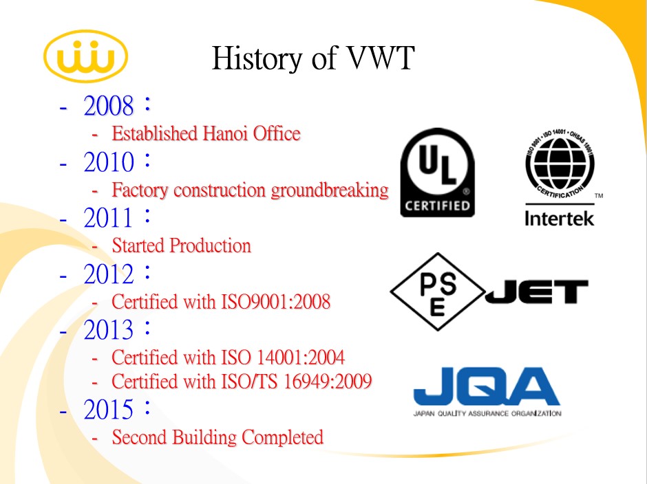 万得福(越南)电线电缆有限公司于2010年在越南海阳成立,是通过JASO和ISO汽车和摩托车标准认证的汽车电线、以及通过UL认证的电气和电子家用电器电线的领先制造商之一。顺便说一下,我们可以从泰国Wonderful进口交联电线和电源线供应越南市场。